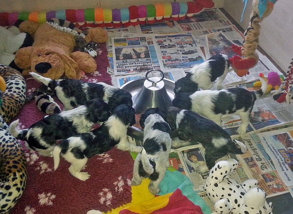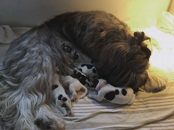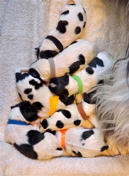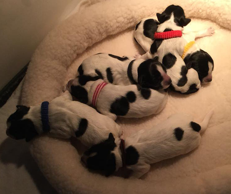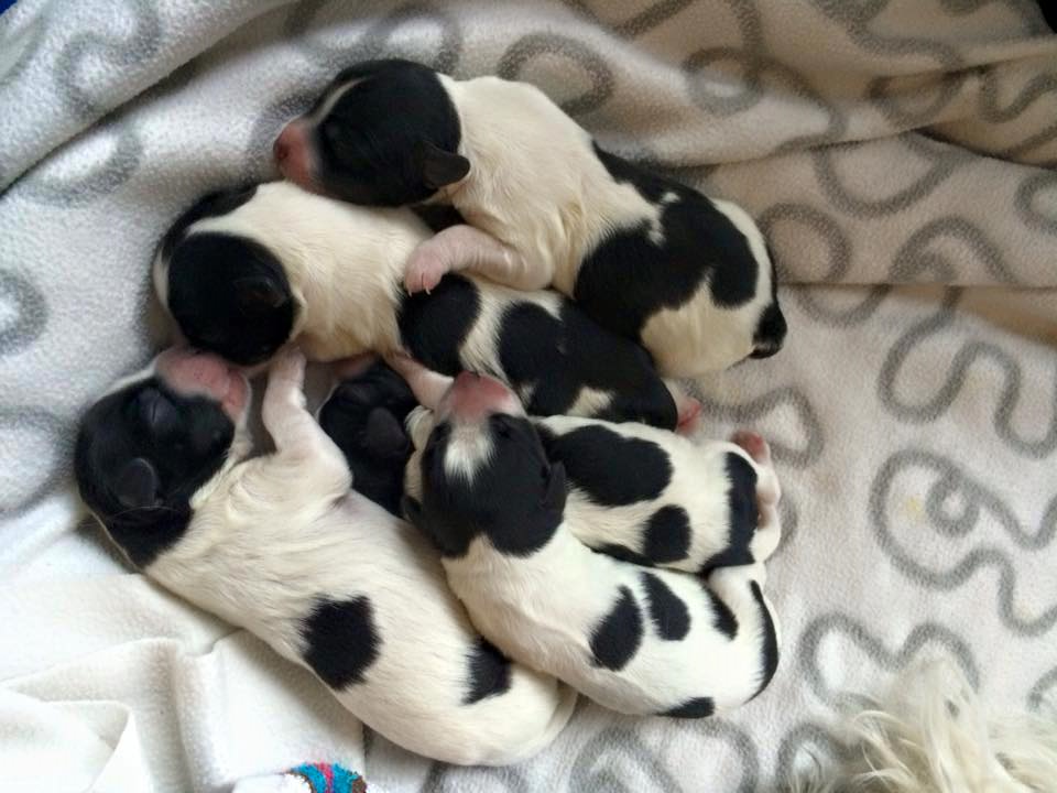 Geboren op 17 mei 2016 uit de combinatie AlmeLola's Macassar van Elsan's Nust x Hopper de la Vallee du Doux : 5 reuen en 7 teven. Dit is het eerste nest schapendoezen geboren in the United Kingdom.